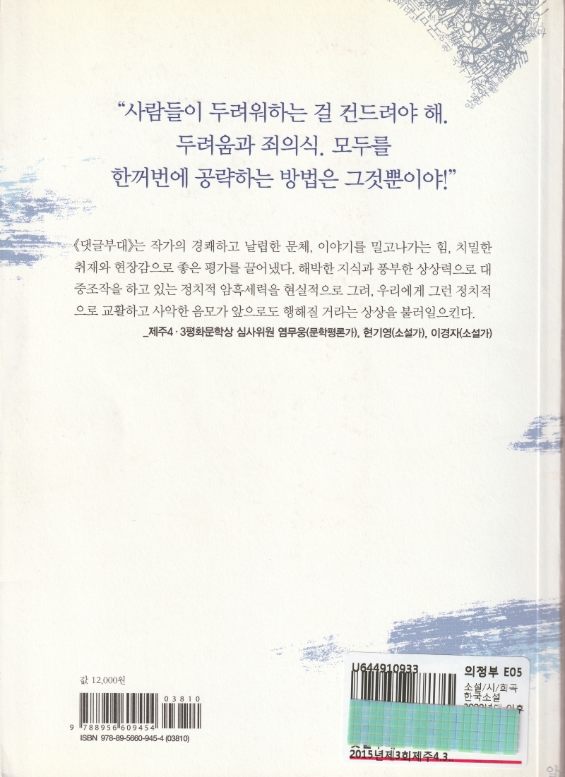 《댓글부대》는 작가의 경쾌하고 날렵한 문체, 이야기를 밀고 나가는 힘, 치밀한 취재로 현장감으로 좋은 평가를 끌어냈다. 해박한 지식과 풍부한 상상력으로 대중조작을 하고 있는 정치적 암흑세력을 현실적으로 그려, 우리에게 그런 정치적으로 교활하고 사악한 음모가 앞으로도 행해질 거라는 상상을 불러일으킨다. _제주 4.3 평화문학상 심사위원 문학평론가 염무웅, 소설가 현기영, 소설가 이경자